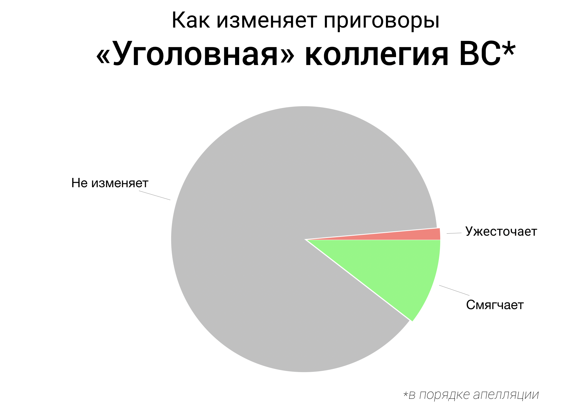 В кассационном порядке коллегия рассмотрела 69 уголовных дел в отношении 77 человек и удовлетворила жалобы и представления по 65 делам в отношении 72 лиц. Четыре приговора были отменены полностью, еще 32 – изменены (все – смягчены).